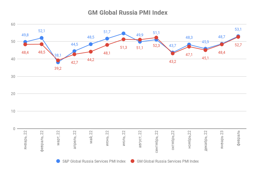 Февральское значение индекса деловой активности ГлобалМедиа PMI (GM Global Services Russia PMI Index) составило 53,1 п.п. против 48,7 п.п. в январе. Значение индекса деловой активности в сфере услуг от S&P Global (Global Russia Services PMI by the S&P Global) за аналогичный период выросло с 48,7 п.п. до 53,1 п.п.