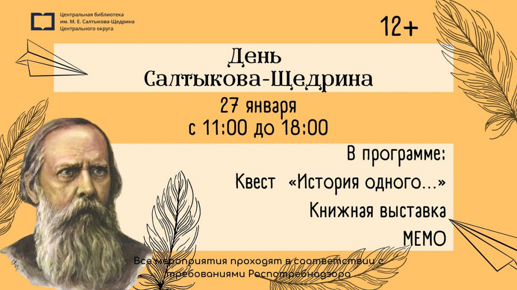 игра «мемо» с иллюстрациями к сказкам Салтыкова-Щедрина; миниквест «История одного» по биографии писателя (нужно будет найти элементы и собрать портрет писателя); литературно-историческое расследование «Инкогнито». Отгадайте деятеля эпохи Михаила Евграфовича, ответив на несколько вопросов; книжная выставка «А что, если бы персонажи Салтыкова-Щедрина прочли эти книги?» книжные закладки «10 фактов о Салтыкове-Щедрине».Дата: 27 января с 11:00 до 17:00.