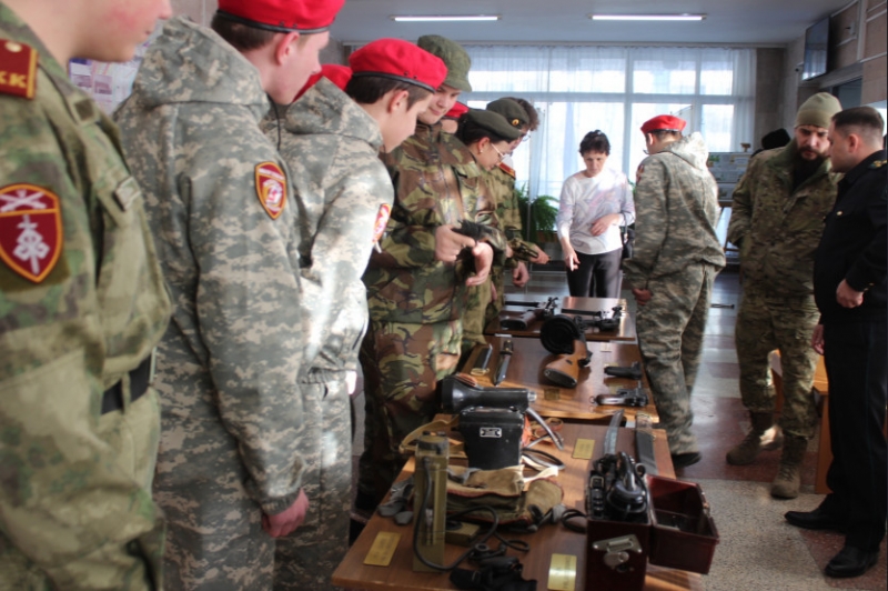 В фойе Детской музыкальной школы Искитима встречала участников военно-патриотического мероприятия необычная выставка – стенды с информацией о пограничных войсках и их истории, оружие и технические средства пограничного контроля, находящиеся на вооружении российских войск.