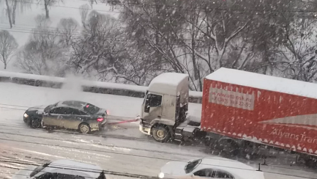 Новосибирские автомобилисты пытались вытянуть застрявшие из-за наледи фуры