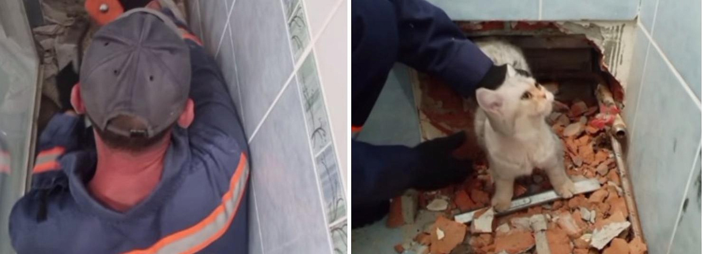 Спасателям пришлось разобрать стену квартиры в Академгородке, чтобы освободить застрявшую между трубами кошку.