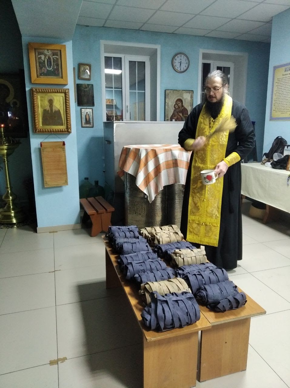 В храме во имя преподобного Сергия Радонежского с. Довольное организован пункт сбора вещей и медикаментов для бойцов специальной военной операции на Украине. Ведется активная работа по пошиву тактических носилок и изготовлению блиндажных свечей.