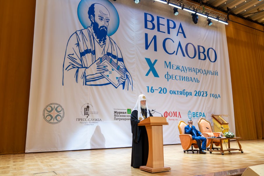 «Мы сердечно Вас приветствуем на юбилейном X фестивале “Вера и слово”, международном фестивале, проходящем по Вашему благословению. Ваше Святейшество, у нас в зале примерно 500 человек из 200 епархий Русской Православной Церкви, 9 стран пастырской ответственности Русской Православной Церкви, а также наши гости — представители светских СМИ, органов государственной власти, общественных организаций — и все с надеждой, радостью и волнением ждут Вашего слова», — сказал В.Р. Легойда.