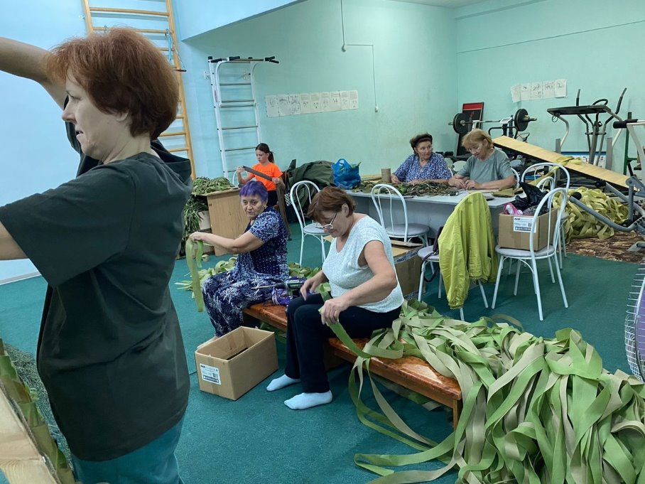 Мешками забирают со склада маскировочные сети парни из 72 бригады и 89 танкового полка.
