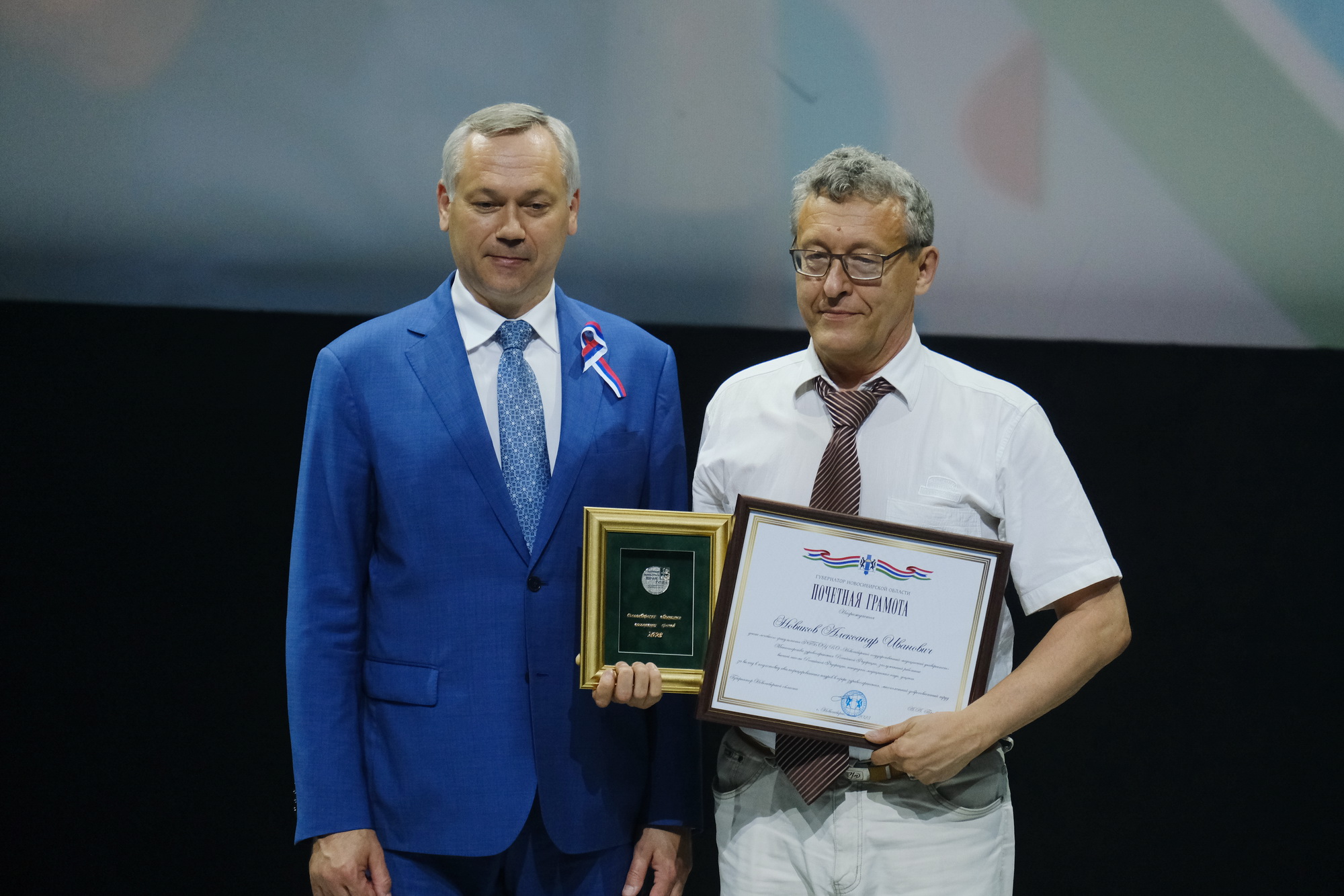 Глава региона вручил Почетную грамоту губернатора Новосибирской области и статуэтку победителю регионального конкурса профессионального мастерства «Врач года 2023» в номинации «Наш учитель» Александру Новикову – декану лечебного факультета Новосибирского государственного медицинского университета.