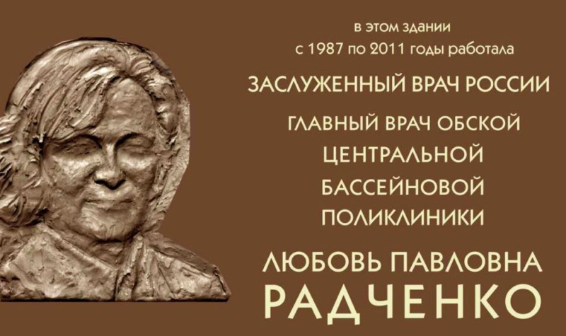 19 сентября в 12.00 по улице Каинская, 15 состоится открытие мемориальной доски, посвященной памяти заслуженного врача Российской Федерации, главного врача Обской центральной бассейновой поликлиники Любови Павловны Радченко (1949-2019).